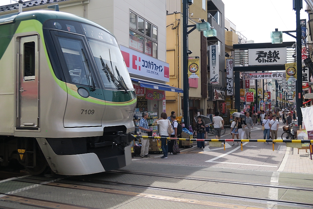 にぎわう商店街の懐かしい風景に新7000系が通りますよぉ~