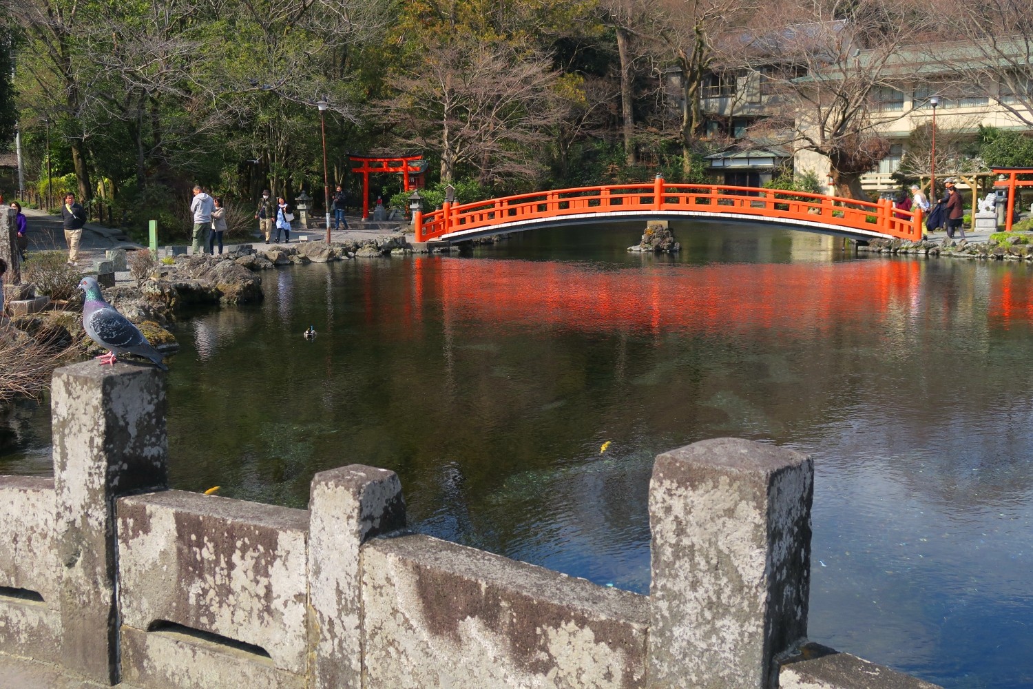 赤い太鼓橋が掛けられている小島には厳島神社もまつられています。