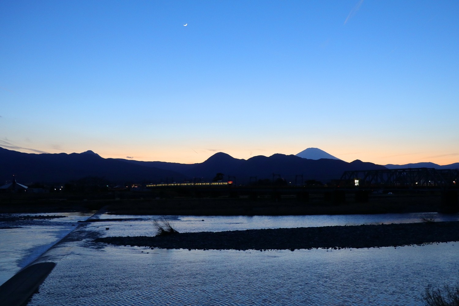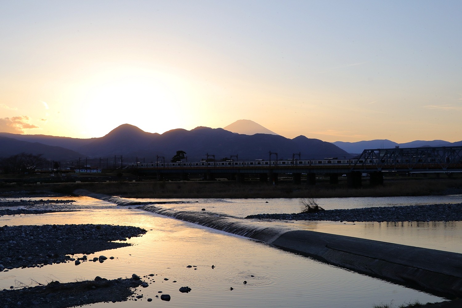 しかし・・・光る川面・山影からの後光・富士山シルエット・列車の存在感・・・