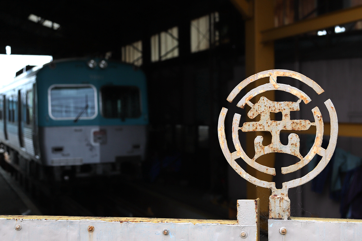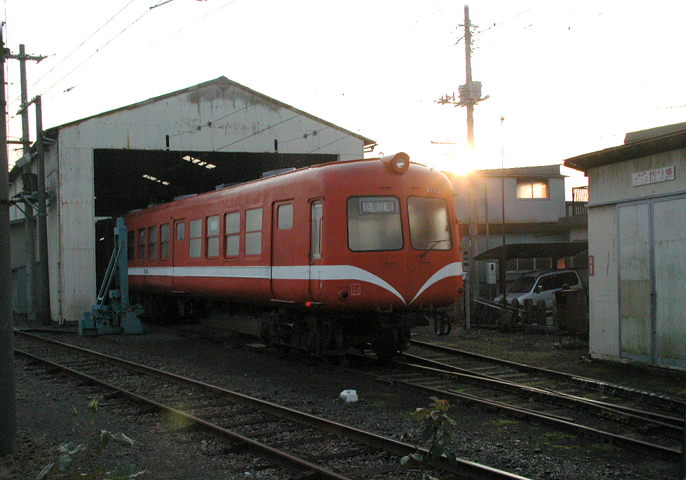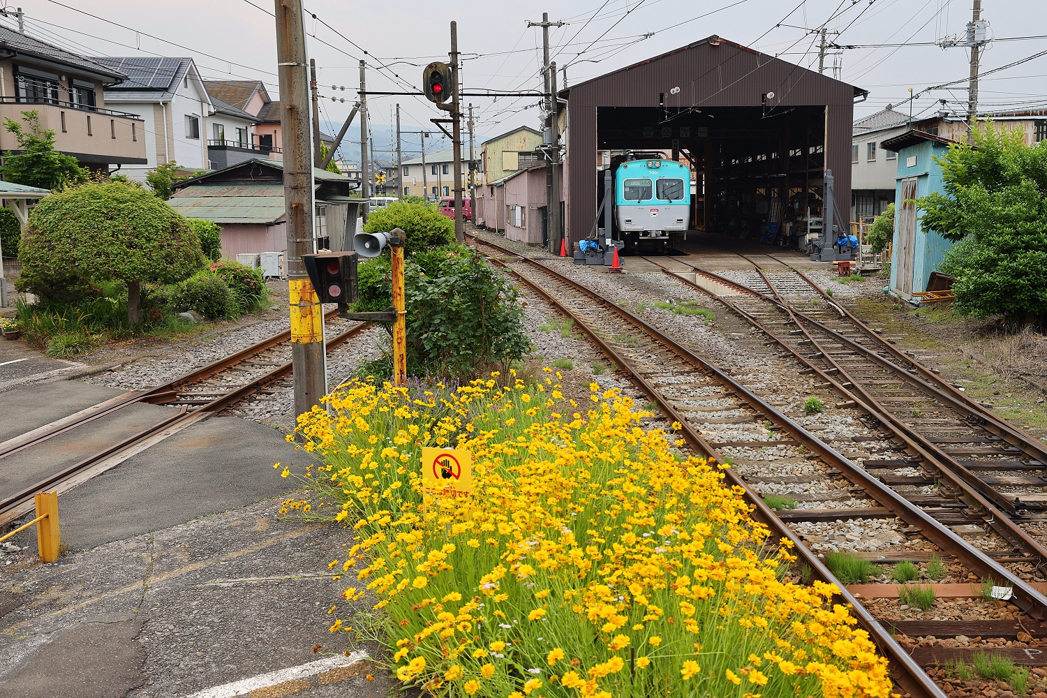 ラッシュおよび検査・教習などを考慮して現在4本の旅客電車を保有していますが、運行的には2本で事足りる岳南線。お休みしてる保有車両の1本は終点・岳南江尾駅に駐機。そしてもぉ1本が検修庫にハウスしています。