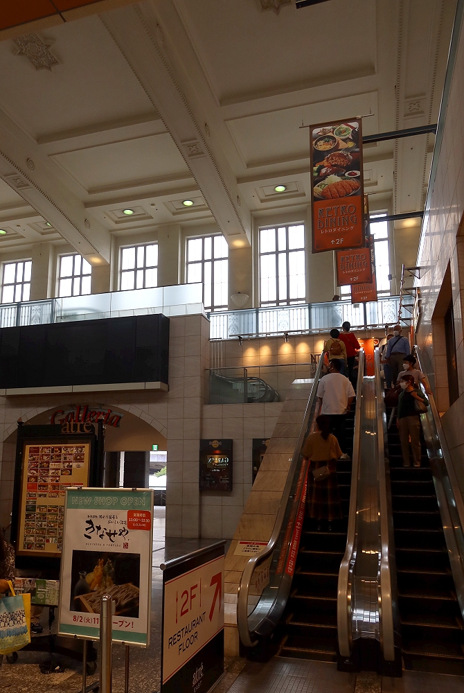 【正面口】の吹き抜け@エントランスや出札窓口区画・貴賓室区画などを商業店舗化!! 2階部両翼@旧駅務区画は飲食店@グルメ街へ生まれ変わり、エスカレーターも設置されました。
