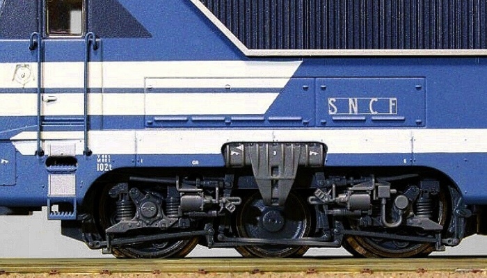 一方フランス機【A1A-A1A 68000】は【BB67000】に旅客列車牽引のためのSG搭載。エンジン出力も1660kW(2230馬力)へアップ!増えた車体重量を中間従軸にて軽減。しかも見た目もアヤシイ! 軸重可変機能も付加されています。