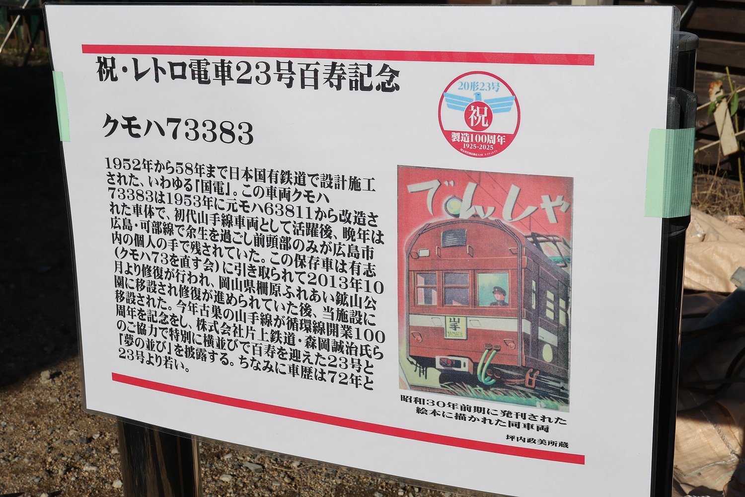 【百寿】の祝いに駆けつけてくれたのは『山手線環状運転100周年』つながり旧63系@クモハ73383号。あの広島の模型店@EF58 36号機と同地に居た可部線カットモデルといえば、、、その筋な方にはわかるかと♪ 2022年から牟礼のNPO法人88(エイティエイト)サンの軒先を借りて保存会が修復作業を行っているそぉな!